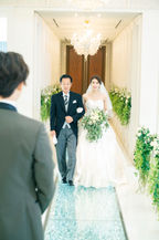【チャペル】花嫁の人生を意味するバージンロードは22mを誇り、それを彩る約3000個のクリスタルは花嫁が出逢った人々を表します。二人を祝福するかのように、柔らかな光の中でクリスタルが煌めきます。