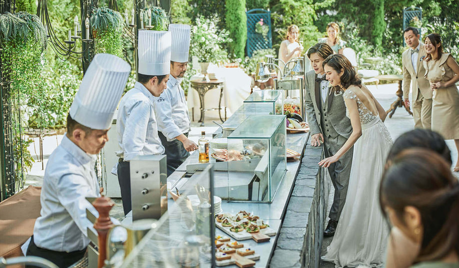 ガーデンに並ぶオープンキッチンからシェフによる迫⼒のライブ演出とともに出来⽴ての料理をお届け「シェフズダイニング」。五感で楽しむ料理でゲストを楽しませます。