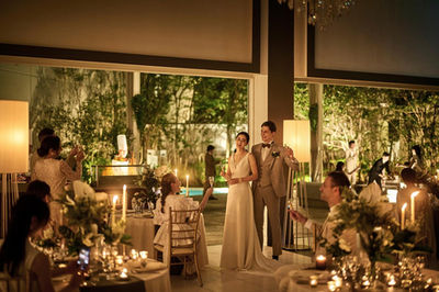 落ち着いてコース料理を味わうパーティ前半から、オープンカー入場などの多彩な演出で盛り上がる中盤、開放的なプール付ガーデンテラスでゆったり寛ぐパーティ後半へ…。家族や親族、仕事仲間、友人…ゲスト一人ひとりとのふれあいを大切に、全員が満足できる新しいウェディングをつくりあげます。